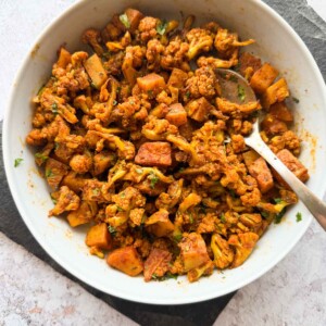 This everyday favorite comes together effortlessly in the microwave, with potatoes and cauliflower cooked until tender and tossed in a flavorful mix of spices. It’s a no-fuss, homestyle sabzi that pairs beautifully with roti or dal-rice.