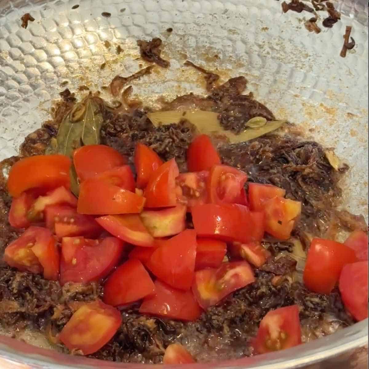Add ginger garlic paste and cook briefly till fragrant. Add tomatoes, mix with the onions and spices, and sauté for 2–3 minutes until soft.